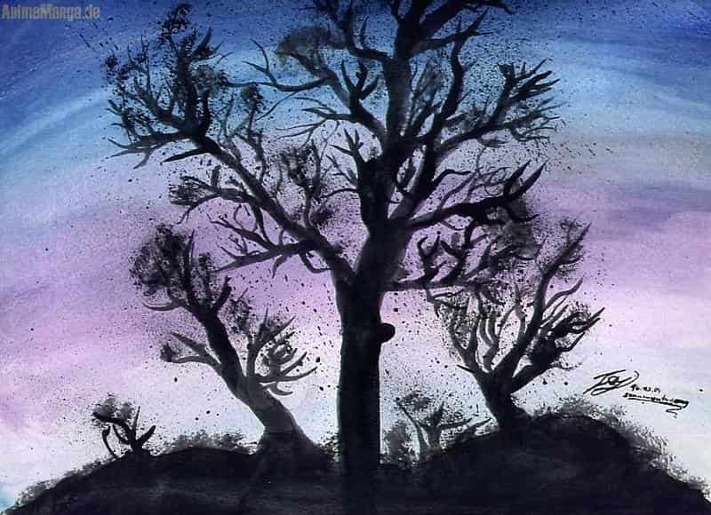 naja was soll ich sagen? das is scho ein paar tage alt(wochen:P) lads mal eben hoch wenn ich scho so gut in der Zeit bin:) ich hatte einfach lust sowas zu malen auch wenn das motiv uralt ist:s also ich meine so einen baum und bla, hehe, ich hab aus meinem fenster aus jeden haben die aussicht auf dem sonnenuntergang ich liebe die siluetten der schwarzen bäume, das bild hatte echt net lange gedauert. habs mit wasserfarben(ziemlich aquarellierend)aufgetragen, zuerst wollte ich ja aquarell hernehmen und tusche, aber aquarell war mit dann doch net kräftig genug und tusche is zu teuerXD naja ich hoffe ihr erm.mögs etwas:)^^'