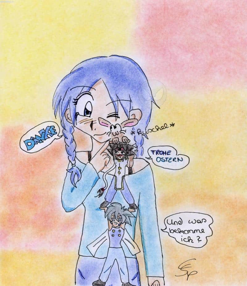 Ray schenkt mir einen Hasen zu Ostern. Und Kai wird gleich eifersüchtig. Der Hintergrund gefällt mir hier besonders gut! Bye, Yuna.