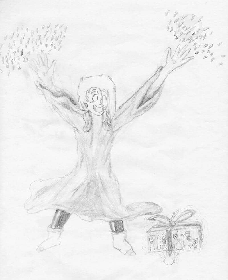 die große person ist(wie könnte es auch anders sein:P) sevel. So wie ich ihn in unseren comics male^^(der steht immer für mich..ja ich weiß:P is´n kerl aber trotzdem) unten in der ecke rackkert sich mini-lutzi mit´n geschenk ab, auf dessen papier andere comic firguren sind^^ (vielleicht kann man sie net erkennen, bin mir jetzt garnet so sicher wie groß das bild überhaupt is:S)