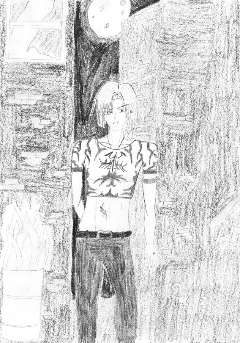 Das soll einen männlichen Vampir bei Mitternacht im Vollmondschein sein. er steht in einer gasse umgeben von hohen häusern. Das offene Fenster hat einen bestimmten grund: Es steht für die offenheit des Vampirs, dass Feuer neben ihm für seine Flamme der Leidenschaft ...... naja hoffe auf Lob sowie Kritik .....