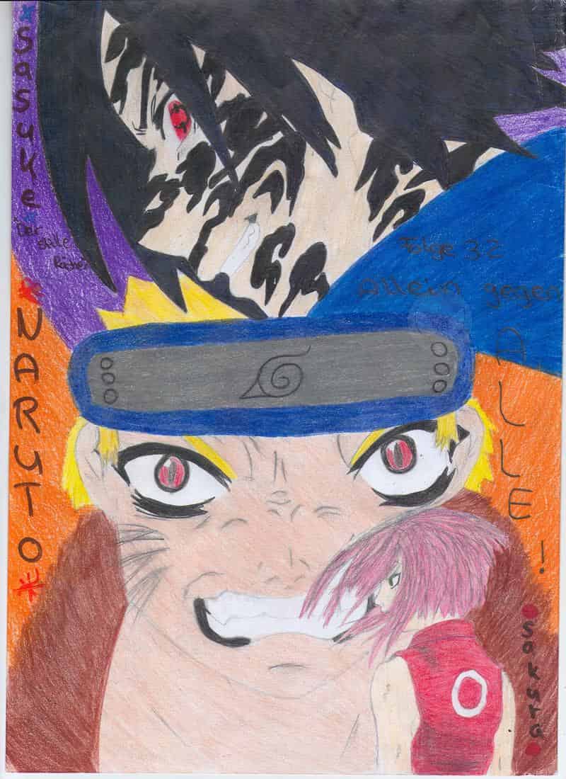 Joar. Das ist ein Fanart zu der Narutofolge 32. Sakuras großer Moment. Ich mag Sakura .___. Und in der Folge fand ich sie besonders toll. Eigentlich sollte sie eine größere Rolle in diesem Bild übernehmen. Doch Naruto und Sasuke treten mehr in den Vordergerund. Ich finds ein wenig schade :( Aber trotzdem gefällt es mir sehr gut .♥ Doch beim scannen sind die Farben ziemlich verblasst.. Ich hoffe es gefällt euch trotzdem.♥
