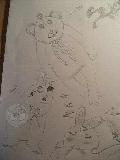 man kanns sicher nich gut lesen... also: oben rechts in der ecke steht >>sweet<<, unten links am häschen steht >>meins<< und beim anderen häschen rechts steht >>mein kissen<< ^^ okee...