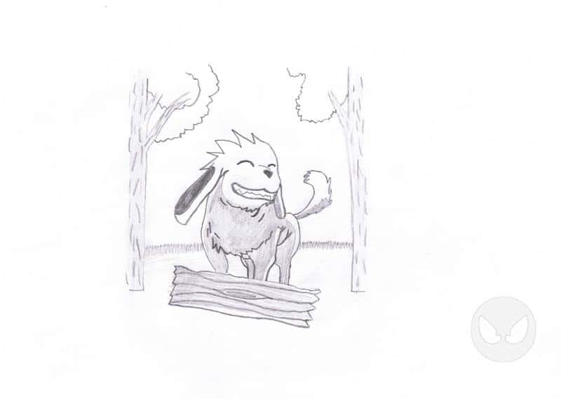 Hier ist von der Serie Naruto der Hund Akamaru und im Hintergrund sind Bäume!