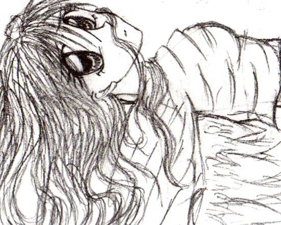 Gleich zu Schulbeginn muss ich doch wieder ein Bild ausstellen.Das ist auch aus dem Artbook.Ich hab mir die Szene so gedacht,dass das Mädchen irgendwo daliegt und sich nicht mehr rühren kann.Sie wartet auf eine Person,die sie aus dieser Lage befreit.Ich glaube der Gesichtsausdruck ist auch ganz gut dazu getroffen.