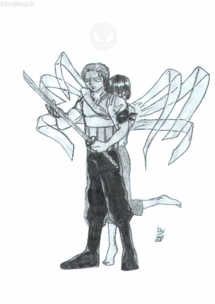 Irgendwie hatte ich zuerst vor Kuinas Gesicht in das Wadoichimonji Schwert von Zorro zu Zeichnen, doch dafür war das Bild zu klein. Also hab ich sie als Schutzengel gezeichnet, um quasi zu symbolisieren das sie durch das Schwert immer bei ihm ist...ob das jetzt wirklich so rüberkommt -> keine Ahnung! :)