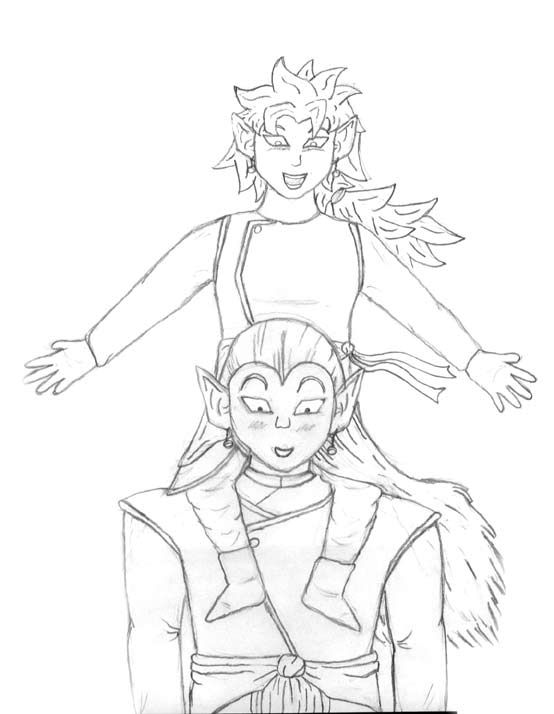 dort sitze ich auf den schultern meines bruders. er hat ein wettrennen mit dem alten kaioshin gemacht.