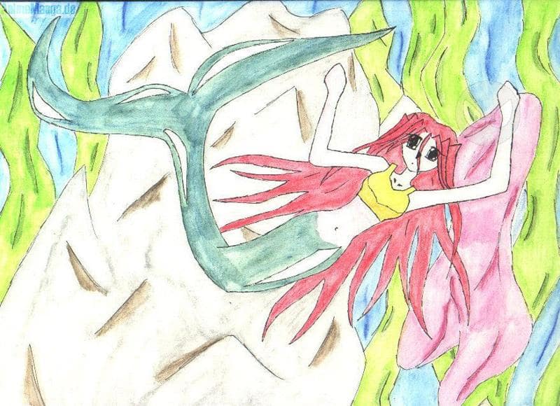 Hi!! Sooo, hier né sweete Meerjungfrau für euch! Diesmal hab ich mich an Aquarell-Stiftis rangetraut, dafür hat das Colorieren 4 Stunden gedauert...(auch wenns nich so aussieht^-^) Die Farben sind durch den Scanner ein wenig dunkler geworden...*grumpf*