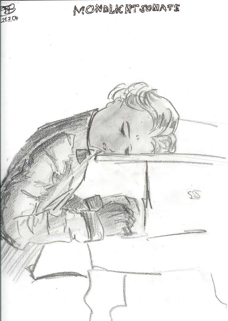 Nun wer den Film doch gesehen hat muesste die Szene kennen (da wo er die Mondlicht Sonate spielt). Einfach nur obersexy der Kerl. Nun dies ist meine Interpretation der Szene im Stil japanischer Animation. Die Szene hat mich sehr inspiriert und so musste ich sie auch gleich zeichnen. Entstanden ist das Bild mit Kohle und Blei-Stiften.