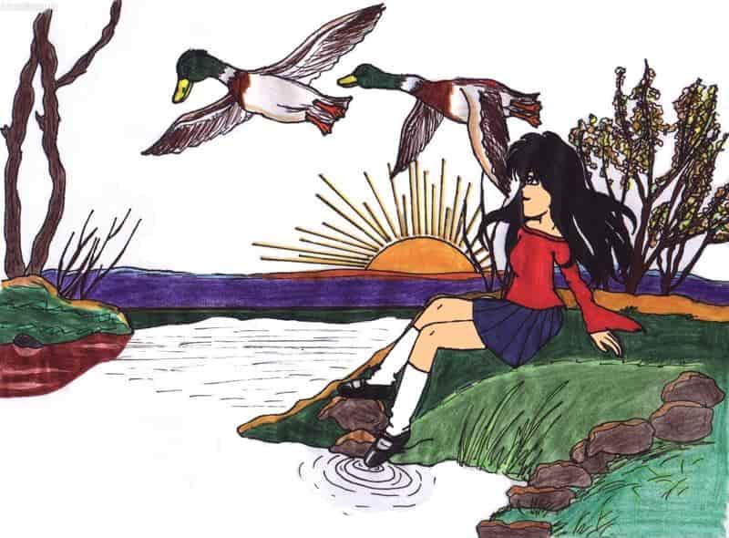 Ich weiß es ist ganz fürchterlich geworden, das liegt an meinem dääämlichen Scanner, der die Farben der Buntstifte verwischt und grau reinmischt, und das Wasser & der Himmel haben keine Farbe, weil das noch hässlicher ausgesehen hätte. ^^°°°°°°
