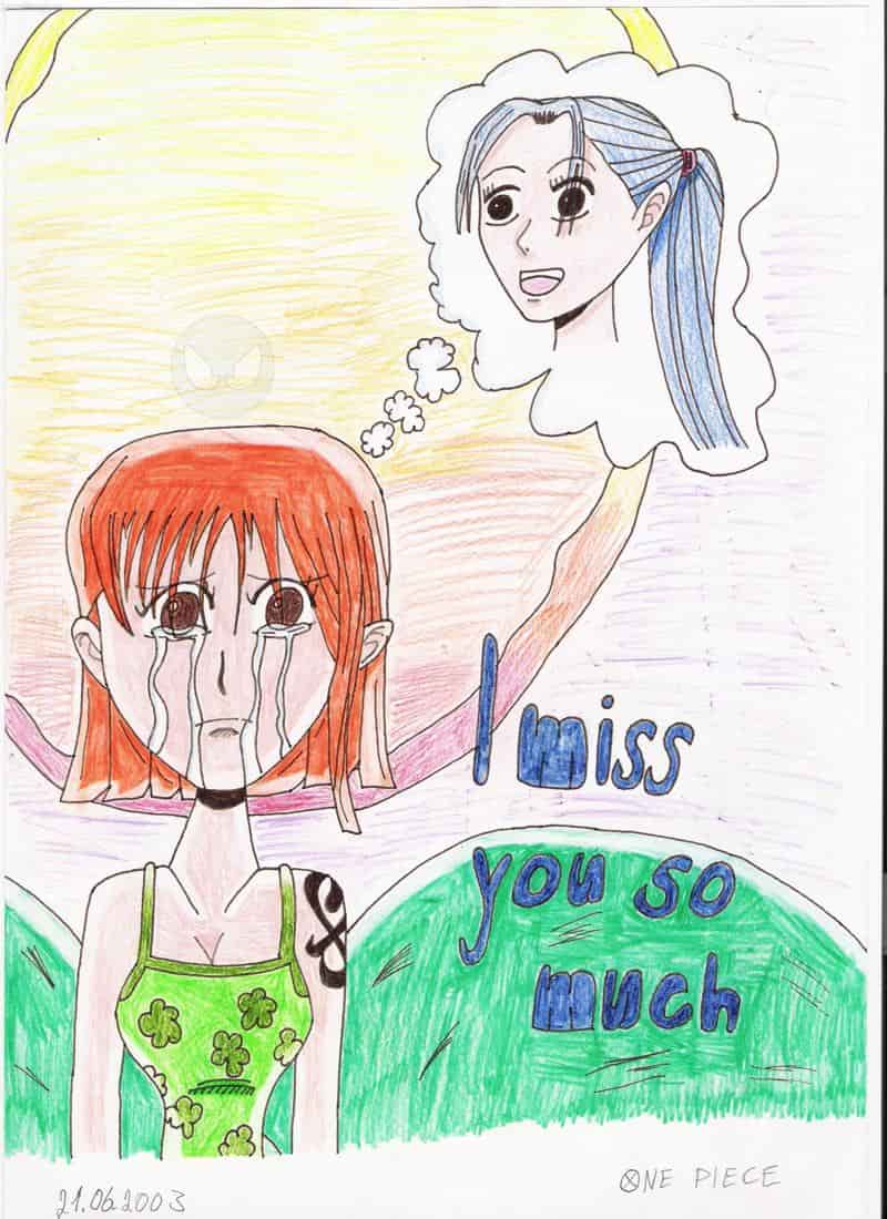 Das hab ich gezeichnet, nachdem ich den Band von One Piece gelesen hatte, indem Vivi sich von Ruffy&Co verabschiedet. Ich find's eigentlich ganz ok, bis auf den Hintergrund, den kann ich nicht leiden -.-