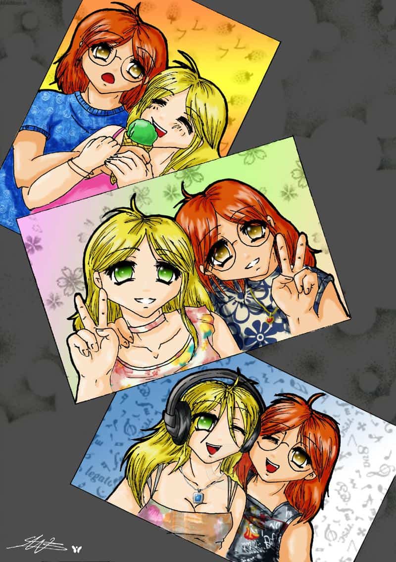 MEINS!!!!!! Drrrrrrrrrrrrrrrrrrrrrr *trommelwirbel* Tatatatatdaaaaaaaaaa !!!!!!!!!! Mein erstes eigenes, allein gezeichnetes, von mir entwickeltes, coloriertes (meinereiner) Bild!!!! MEINE outlines, MEINE coloration... MEINE freundin ^^ erstmal ein riiiiiiiiiiiiieeeeeeeeeeesssssssssssssseeeeeeeennnnnnnnnn GROßES DANKESCHÖN an meine Freundin Jenny (die blonde auf dem Bild). SIe hat *gottseidank* einen Scanner und hat mir freundlicherweise das Bild eingescannt ( sie hat gesagt, dass sie das auch mit anderen von meinen Bildern machen kann *freudeuch*), deshalb hab ich auch dieses Bild gezeichnet, als erstes eingescanntes!!! P.s.: Die situationen auf den 3 bildern ist nicht gestellt (sowas haben wir wirklich). Wir sind eigentlich ziemlich verschieden (wie man auf dem Bild auch sieht: Sie: Helle Haare und meist pinke oder helle Klamotten, Ich: Rote (gefärbt mit braunem ansatz ^^, und eher dunkel angezogen, meist schwarz[sieht aber auf bildern doof aus] meine Lieblingsfarbe[neben blau]). Jenny und ich kennen uns schon ziemlich lange ... öhm... so... ca. 12 Jahre. Wir haben schon viele verrückte sachen erlebt. Ich erklär euch mal die Bilder. Bild1: Jenny und ich sind rutinierte Eisdielen gänge (allerdings gebe ich ihr meist eis aus), unser lieblingseis: Bananacup. Bild2: Ich hab mich dabei an eine Situation in einem Fotofix-Automaten errinert, damals saß Jenny auf meinem Schoß und wir haben uns in den Kasten reingezwängt und dann sind wir rausgefallen ^^ *warlustig* Bild3: Wir sitzen in der Schule nebeneinander und wen einer Musik dabei hat hört der andere mit (obwohl wir einen sehr unterschiedlichen Musikgeschmack haben), allerding nicht mit so großen Kopfhörern, sonder nur Ohrstöpsel (sieht aber auf Bildern doof aus). So das wars erstmal wieder von mir, Nochmal ein Dickes, Fetes, Riesengroßes DANKESCHÖN an Jenny. Eure bibi59457