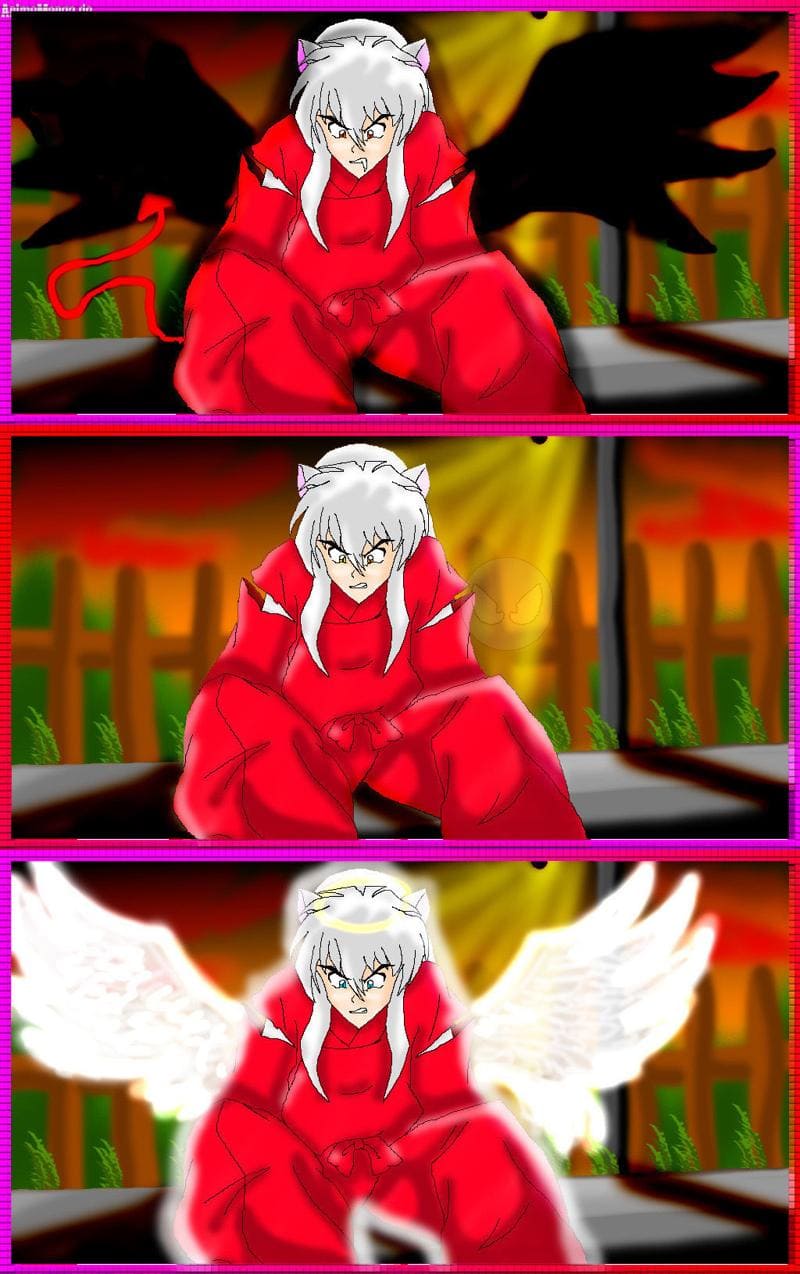 Ist wieder mal in PC gezeichnet worden. Das Bild war sehr schwierig hab 9 Stunden dafür gebraucht *fix und fertig ist*. Hab mein besstes gegeben aber es war nicht genug........... Ich hatte zu erst denn Mittelen Inu gemacht... und dann irgentwie kamm mir diese Idee, mit Engel usw... Einfach nur so!!! Fals mann das nicht sehen kann der erste Inu (in der Reihe) hat rote Augen. Der zweite hat gelb/orange und der letzte hat blaue Augen! XD