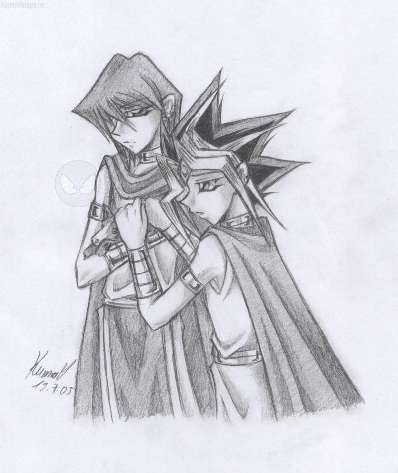 So, und schon wieder ein neues Pic. ^________^ Ich muss mich mal herzlich für so viel Lob bedanken *zu den anderen Bildern glozz* Ich krieg immer so viele nette Kommis... ;___; *Freudentränen* Nicht aufhören, ich will noch MEAAAAAARRRRRRR XDDD So, und nun zum Bild: Es ist eine Szene aus einem meiner RPGs. Ich fand das so süß, dass ich es einfach aufzeichnen musste ^^ Seth hält auf seinem Arm einen kleinen Windhundwelpen... Ich musste extra nachschlagen, wie so ein Hund überhaupt aussieht... o.O Hat nicht viel genützt, fürchte ich. Ich kann einfach keine Tiere zeichnen! ^^" Was mir noch nicht gefällt, ist Atemus viel zu langer Arm, der mit dem Rest seiner Größe nicht übereinstimmt (der muss ja RIESIG sein, für seine Verhältnisse). Die Hand ist mir auch misslungen und Seths linker Arm sieht aus, als würde er zu Atemu gehören (und somit den Rechten darstellen... v_v). Außerdem tragen Beide daselbe. Ich hatte keine Lust, mir nen Manga zu schnappen und den Beiden die Originalkleidung anzuziehen... Und nun, was ich mag: Die Gesichter der Beiden, weil sie so geworden sind (vor allem Seth), wie ich es mir vorgestellt hatte, die Haare (so ausnahmsweise mal...) und Seths rechter Arm! Den finde ich ganz okay. ^^" Aber das ist nichts zu dem, was es zu bemängeln gibt... *_* Das Bild war nämlich zunächst nur ein Krikel, aber mit der Zeit dachte ich "Ach, Kuma, mach da mal ein wenig Schatten rein und zieh die Linien ein wenig sauberer, es wäre zu schade um das Bild". So kam es, dass so viele Fehler drin geblieben sind. Ich war schlicht und einfach zu faul, noch mal alles neu zu zeichnen XP. Wenn man bedenkt, dass Seths Blick so toll ist... Den wollte ich einfach nicht wegschmeißen... <.< Ich widme das Bild natürlich Susichan, weil das RPG, aus dem ich diese Szene "geklaut" habe, von ihr und mir stammt. Wir beide wären übrigens sehr dankbar, wenn man unsere RPGs lesen und uns einen Kommentar dazu per PN schreiben würde, wir wollen sie nämlich in Fanfics umwandeln. Hiemit bitte ich also alle, wenn sie gerade nichts besseres zu tun haben (und das Pairing SetoxYami und SethxAtemu mögen und AUSSERDEM nichts gegen yaoi haben *eg*), sich "Gefühlschaos und Klassenfahrten" (abgeschlossen), "Zurück in der Zivilisation" (neu gestartet; Fortsetzung zu "Gefühlschaos und Klassenfahrten") und "~*Vorurteile*~" zu lesen. *verbeug* Wir würden uns wirklich sehr darüber freuen!!! So... Ich glaub, das war Werbung genug... ^^" AUF ZU DEN KOMMENTAREN!!! *freeeeeeeeu* *noch mal verbeug*
