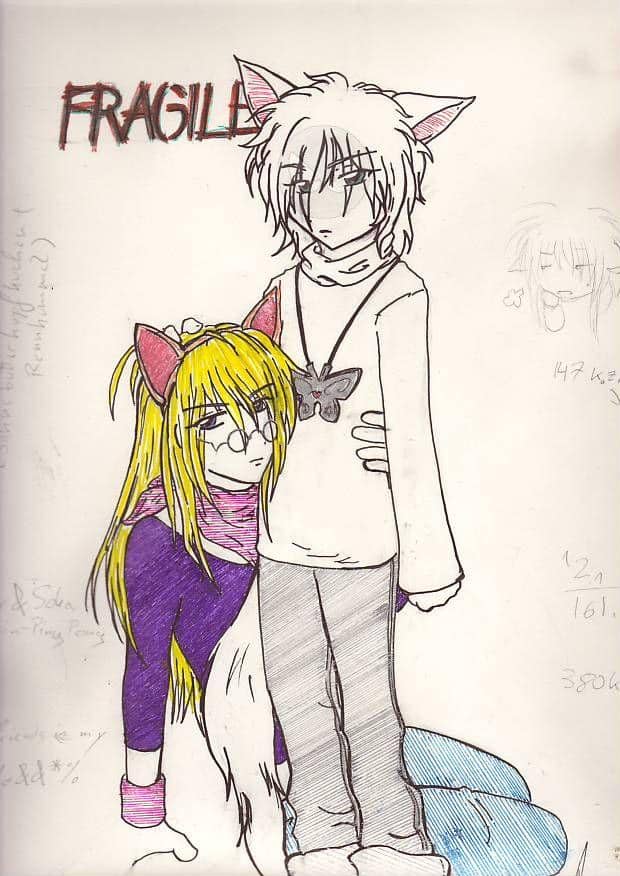 Okay, das ist eins eeehr seltsames RPG-Pärchen... sowas entsteht, wenn man sich dafür entscheidet, Soubi aus Loveless zu playen, obwohl es innerhalb der Playergruppe keinen Ritsuka gibt... Die helle Gestalt da ist dementsprechend ein Chara meiner Freundin: Rei Kura. Bitte ignoriert die Notizen und das Gekritzel am Rand ebenso wie die verschmierten Teile des Bilds, das passiert einfach, wenn man sowas längere Zeit as Mausunterlage benutzt ^^\'\'\' Die Colo sieht real auch nicht ganz so schrecklich aus, aber mein Scanner mag diese seltsamen Glitterstifte nicht...