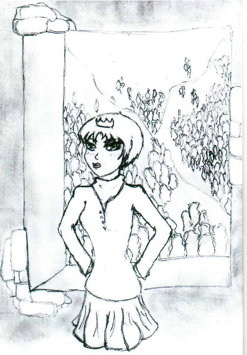 Wundert euch nicht, dass das Mädchen keine Beine hat, aber ich kann einfach keine Beine zeichnen. Das muss ich wohl noch üben... Das im Hintergrund sollen übrigens Berge mit Bäumen drauf sein. Aber nachdem ich das Bild eingescannt hab und verkleinert hab sieht man das leider nicht mehr so gut.
