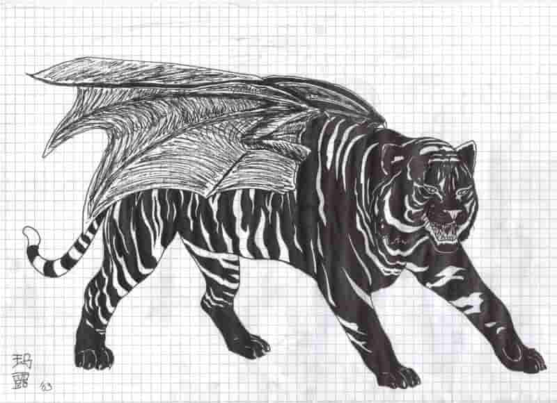 Nimen hao! ja, glaubt es oder glaubt es nicht, ich lebe noch. ich hatte in der letzten zeit (heißt monate) nur wenig lust, zu zeichnen, auch nur wenig zeit. ich hab mich dann mal einen sonntag hingesetzt und einen tiger gezeichnet, eigentlich nur eine übung für meine facharbeit in kunst. aber dann ist mir eingefallen, dass man dem ein paar flügel verpassen könnte. und dann hab ich beschlossen, seine streifen weiß zu machen und den rest schwarz. das kam dabei heraus, ein geflügelter laohu ^^