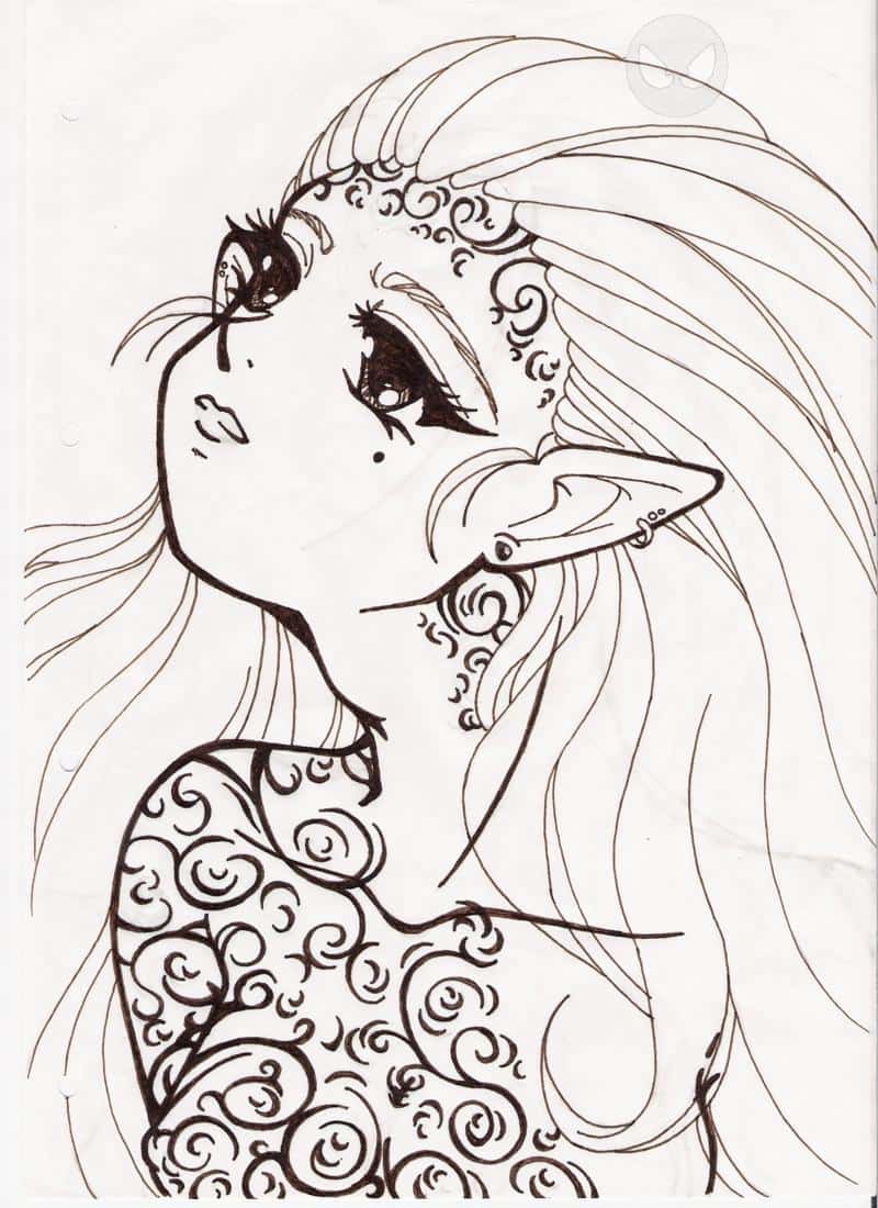 Dieses Bild ist mit eines meiner Lieblingsbilder. Es soll eine Art Unterwasser-Fee darstellen ^^... Hatte da so ein Kopf im Bild und habe es umgesetzt. Hier ist das unkolorierte Bild, welches ich mit schwarzem Fineliner nachgezeichnet habe. Es ist aus dem Jahr 2004. Ich weiß nicht wie ich drauf gekommen bin, den Charakter so zu gestalten... Ich finde es klasse, mit diesem Muster auf der Haut. Es taucht auch auf einem anderen Charakter von mir auf.