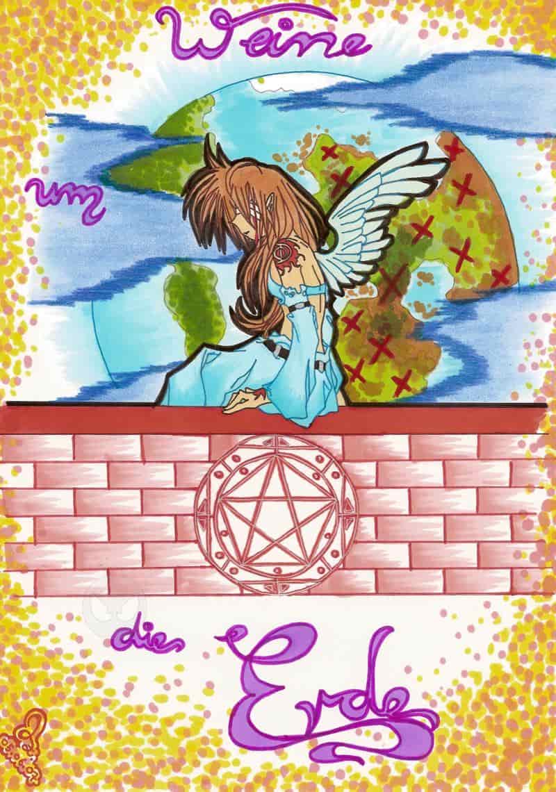 Der Leitspruch „ Gott gab jedem Menschen nur einen Flügel. Um zu fliegen, müssen sie sich umarmen !“ gab mir den groben Bildinhalt dar. (Bluttränen weinender eingeflügelter Engel)