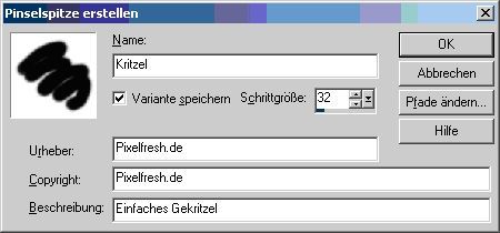 Bist Du nun an dieser Stelle angelangt, öffnet sich ein Fenster indem Du neben der Voransicht Deines „Brushes“ nun auch noch verschiedene Informationen eintragen kannst. Hier kannst Du, wie in Abbildung 3 gezeigt nicht nur Deinem Pinsel einen Namen geben, sondern neben einer Kurzbeschreibung noch den Urheber und entsprechend den Copyright-Berechtigten eintragen.