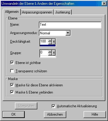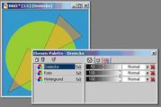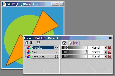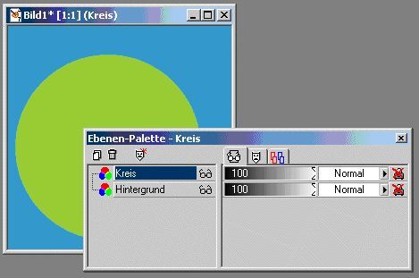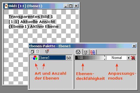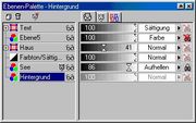 Der Übersichtlichkeit halber, existiert auf jeder Ebene eine so genannte Ebene-Palette. Diese beinhaltet ein eigenständiges Fenster (siehe auch Abbildung 1) mittels dessen Du in der Lage bist die Eigenschaften Deiner Ebene exakt festzulegen.