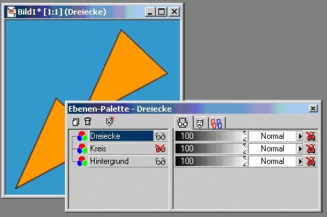 So, nun legst Du noch eine weitere Raster-Ebene an. Diese kannst Du beispielsweise „Dreiecke“ nennen. Zeichne nun auf den Grund Deiner neuen Ebene zwei Dreiecke. Auch die beiden Objekte sollten sich deutlich von der Farbe Deines Hintergrundes absetzen. Auch hier kannst Du eine beliebige Farbe wählen. Wie dies im Detail aussehen können soll Dir Abbildung 21 erläutern.