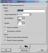 Es ist Dir möglich, sämtliche Ebenen-Einstellungen kann man nicht nur in der Ebenen-Palette realisieren, sondern ebenfalls in deren individuellen Eigenschaften jeder einzelnen Ebene. Die Eigenschaften einer Ebene rufst Du auf, indem Du mit der rechten Taste Deiner Maus, die Ebene anklickst oder das Dialogfenster zu den Eigenschaften mittels einem Doppelklick öffnest (Beispiel Abbildung 26).