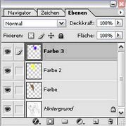 Möchtest Du mit mehren Farben arbeiten, ist es sinnvolle jede Ebene mit einer einzelnen Farbe zu benennen. Die einzelnen Ebenen müssen nicht unbedingt „Farbe 1“, „Farbe 2“ etc. heissen, sondern können auch eindeutig mit Namen der einzelnen Farben „Rot“, „Grün“ etc. benannt werden. Ein Beispiel wie sich dies in Deiner Ebenenansicht darstellen könnte, beschreibt Abbildung 3.